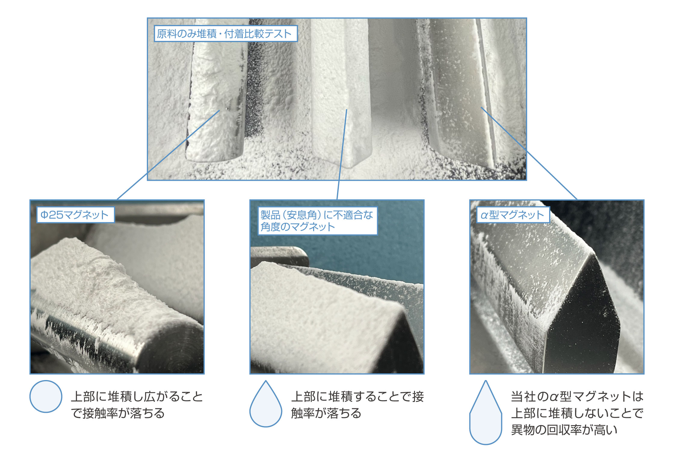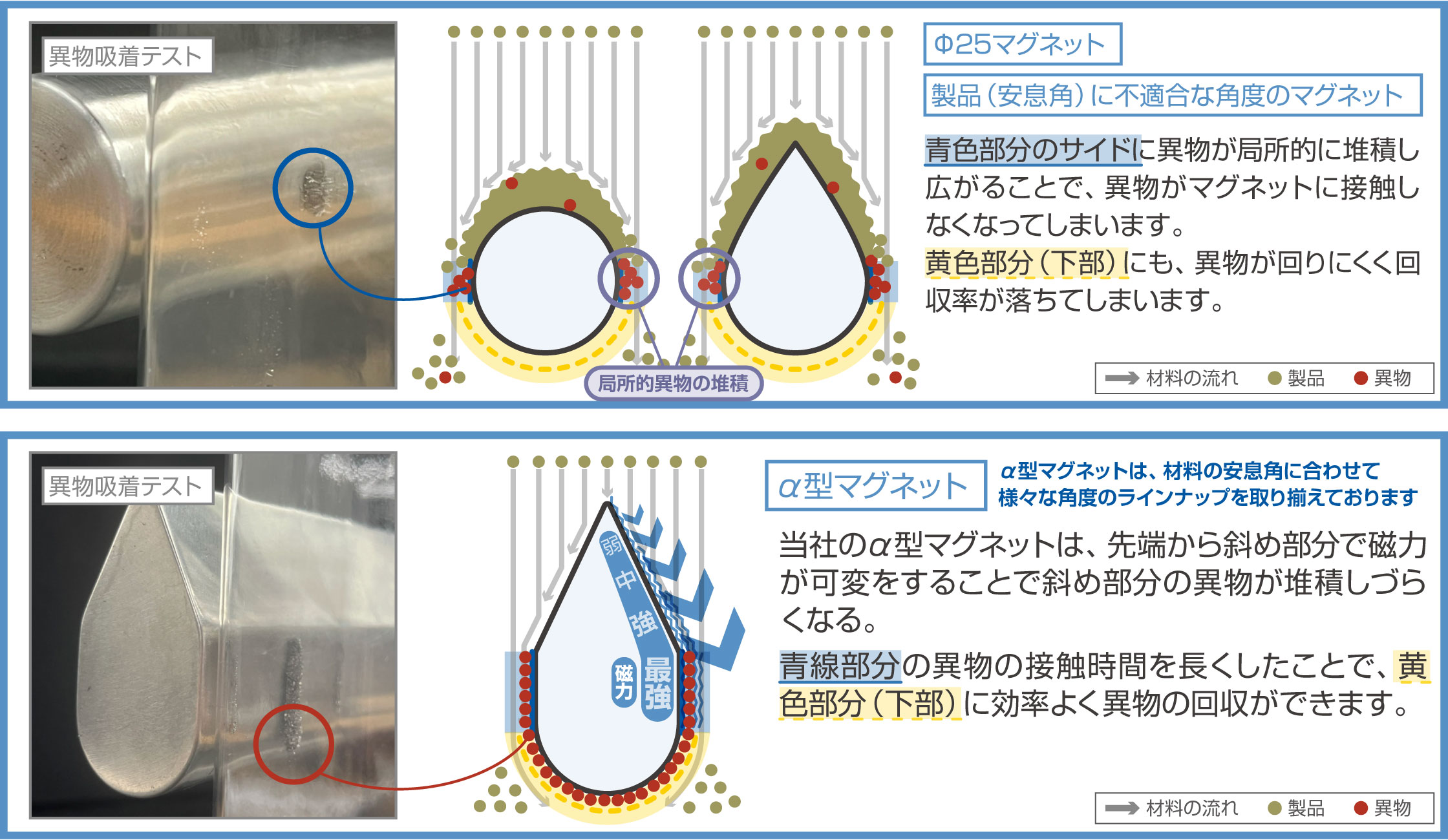 α型マグネットは材料の安息角にあわせて